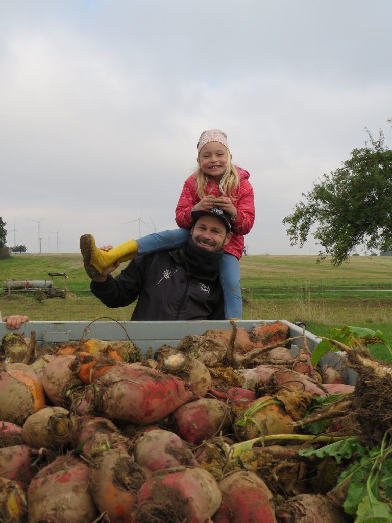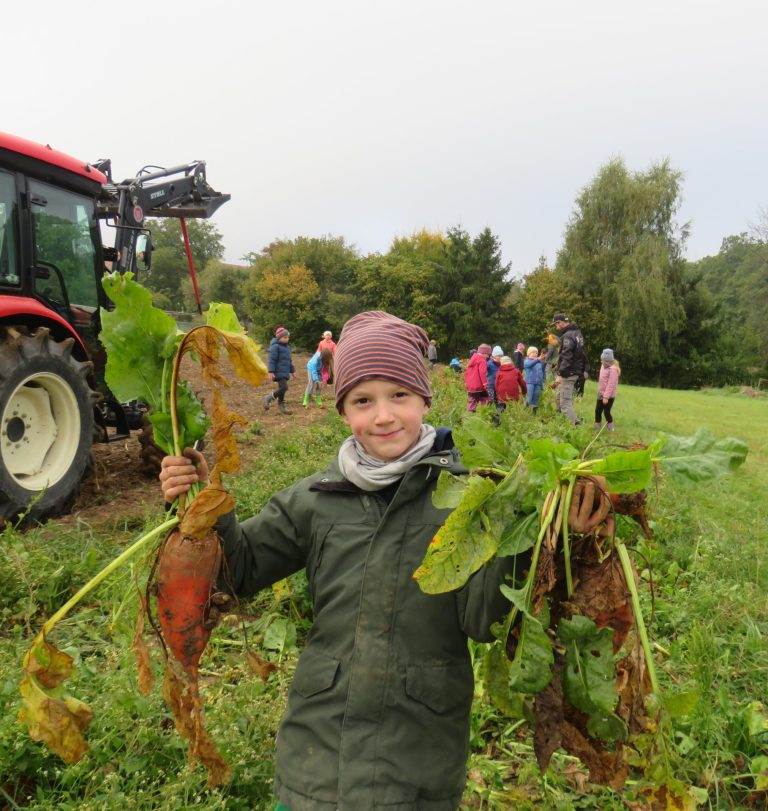 Vor den Herbstferien startete Klasse 2 in Richtung Mertendorf bei Schkölen, um im Rahmen der Herbstexkursion bei der Ernte der Futterrüben/Runkeln zu helfen. Auf dem Hof der Familie Magi durften die Kinder tatkräftig mit anpacken, Traktorfahren, Rüben sortieren und abschließend auch die Schafe füttern.